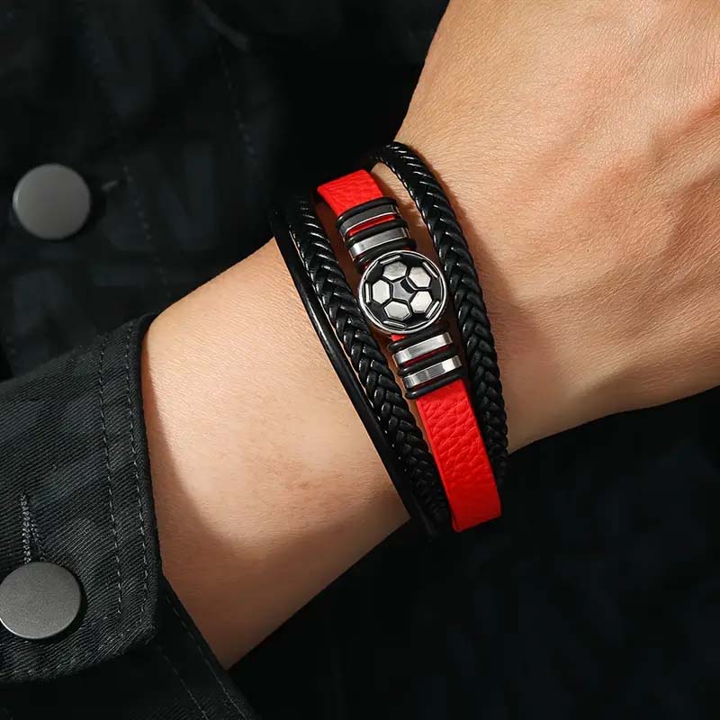 - Monikerroksinen nahkakudos: Rannekkeen nauhat on valmistettu useista nahkalankakerroksista, jotka on kudottu yhteen teksturoidun ja karhean ulkonÀön aikaansaamiseksi. Nahkalanka on pehmeÀÀ ja muotoutuu ranteeseen ajan myötÀ, mikÀ lisÀÀ kÀyttömukavuutta.