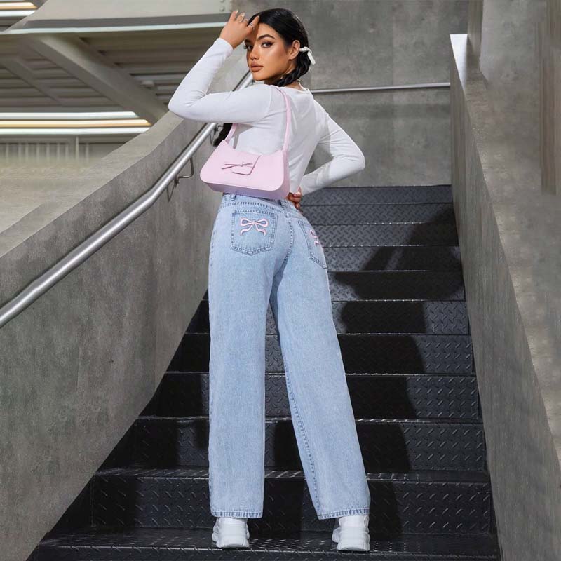 - 1 x Korkeavyötäröiset Rusetilla Kirjaillut Farkut