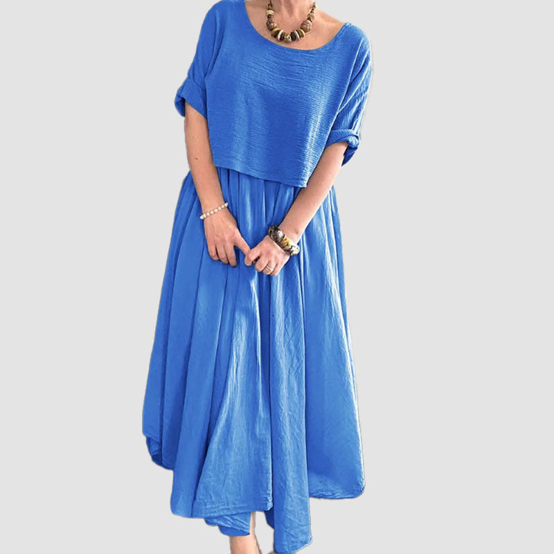💐✨Mukava ja tyylikäs naisten puuvilla ja pellava kaksiosainen setti, jossa on pyöreä kaula-aukkoinen pusero ja hame